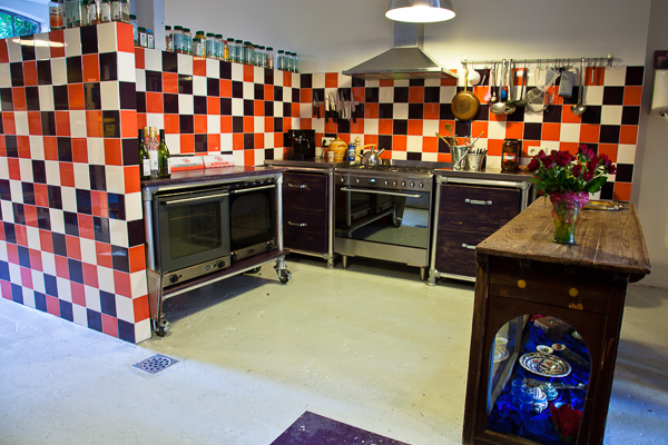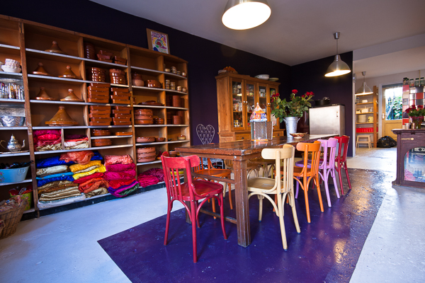 Het verbouwen van een voormalige dierenwinkel naar een professionele catering bedrijfsruimte bood de kans om naast een kleurrijke keuken ook een proeflokaal in te richten. Simone van Bezooijen van Rode Rozen en Tortilla’s houdt hier kookworkshops en proeverijen.